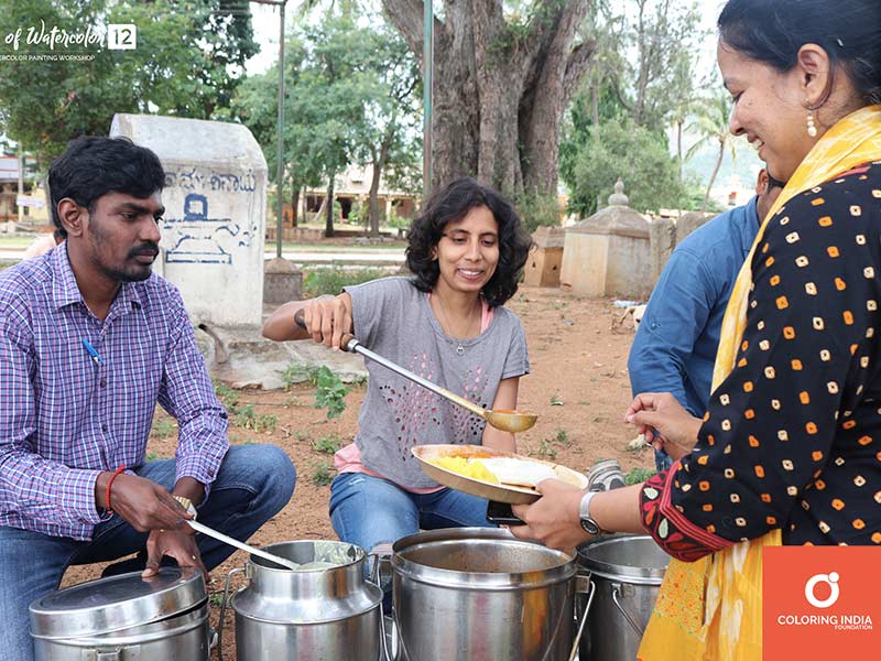 The specialty of the Hues of Watercolor 12th edition – Plein air painting workshop by Milind Mulick was that the team made an excellent effort in keeping the participants with proper hygienic food. A comfortable bus was arranged by the team for the long journey. And the choice of location was calm and apt for Milind Mulick’s demonstration.